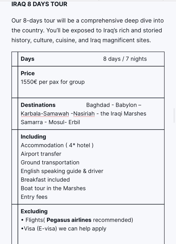 Arrive at your convenience into Baghdad – the capital city of Iraq a day before the tour starts to . ◦ Transfer to Hotel using registered Airport taxis whose waiting for you at the airport
